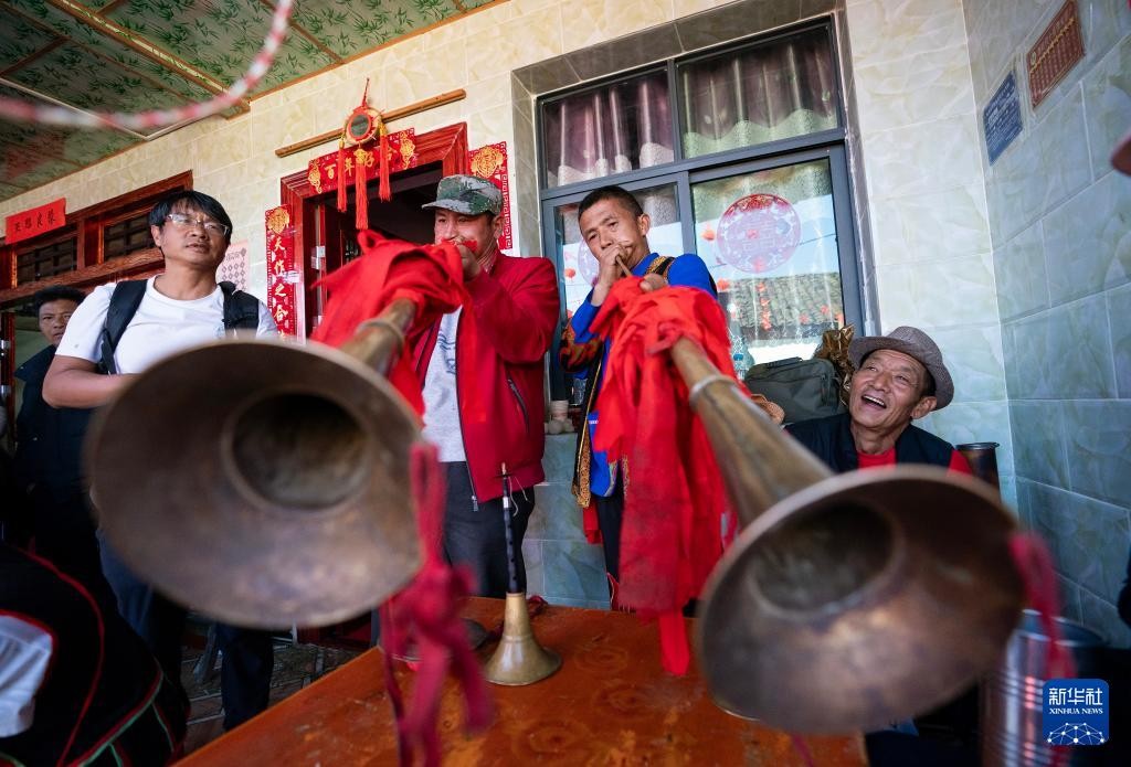 2月7日,乐手在南涧县宝华镇拥政村一农户家的婚礼跳菜上吹奏乐器。新华社记者陈欣波摄