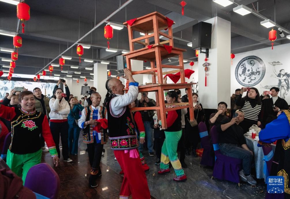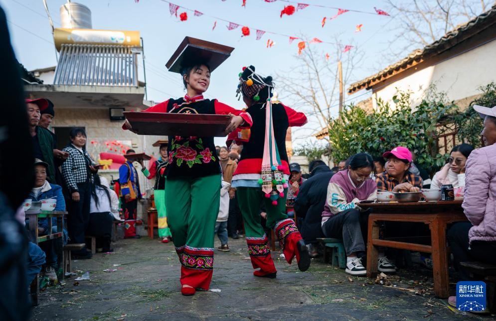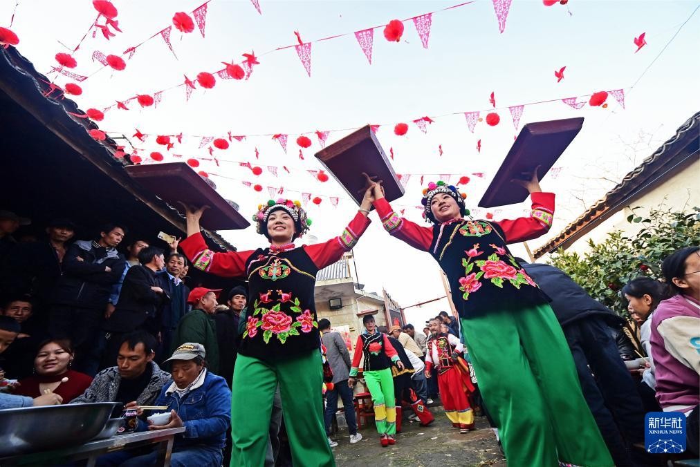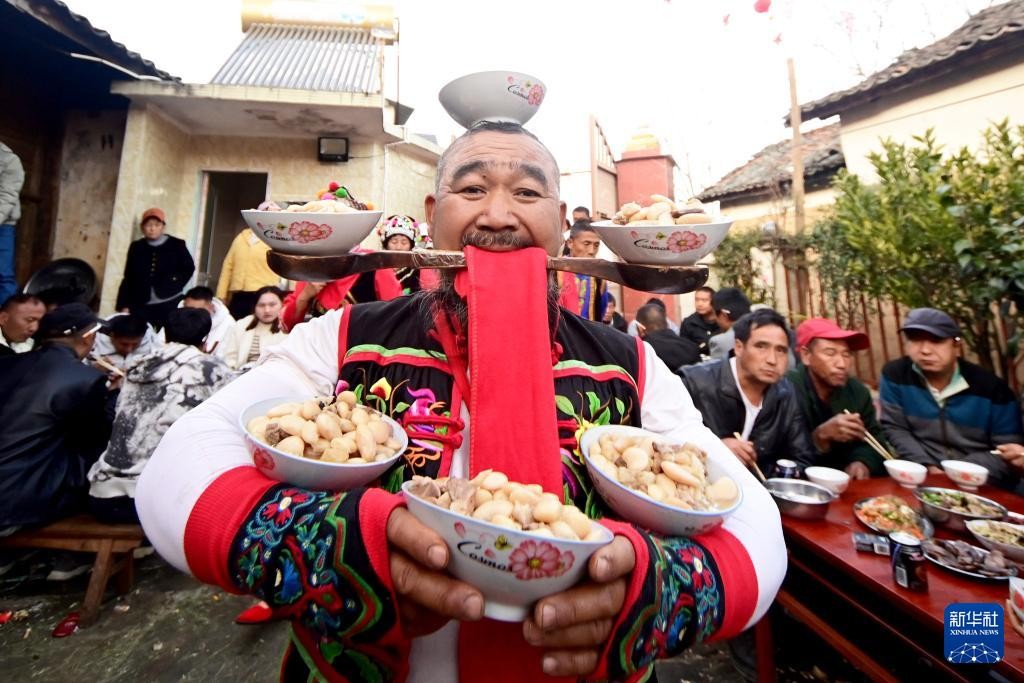 2月7日,在南涧县宝华镇拥政村,跳菜表演者在进行口功上菜表演。新华社发(适志宏摄)