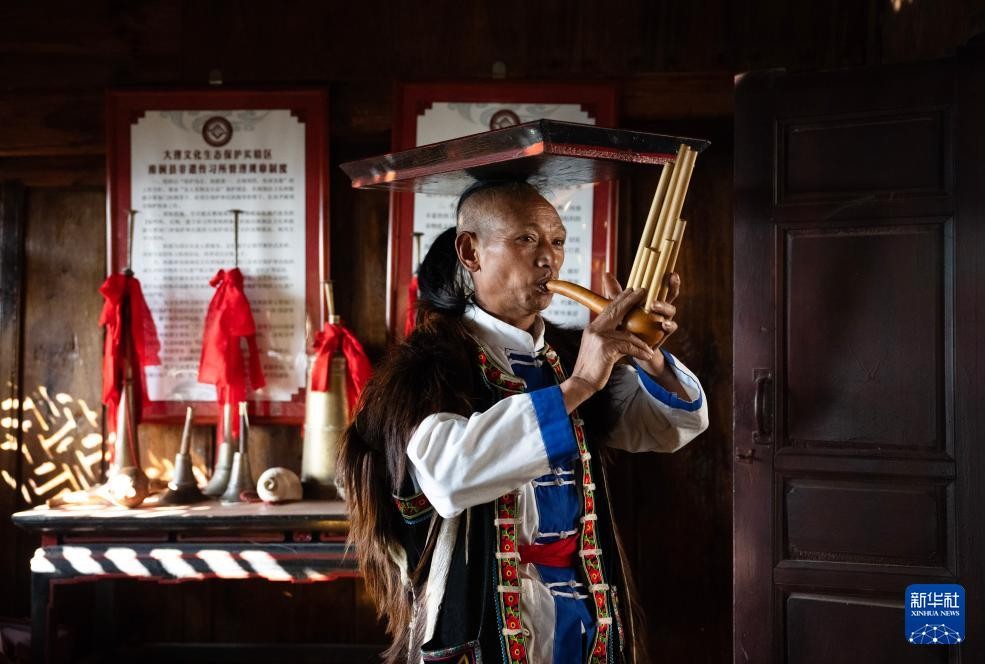 2月7日,南涧彝族跳菜国家级非物质文化遗产代表性传承人鲁朝金在非遗传习所内演示跳菜技艺。新华社记者陈欣波摄