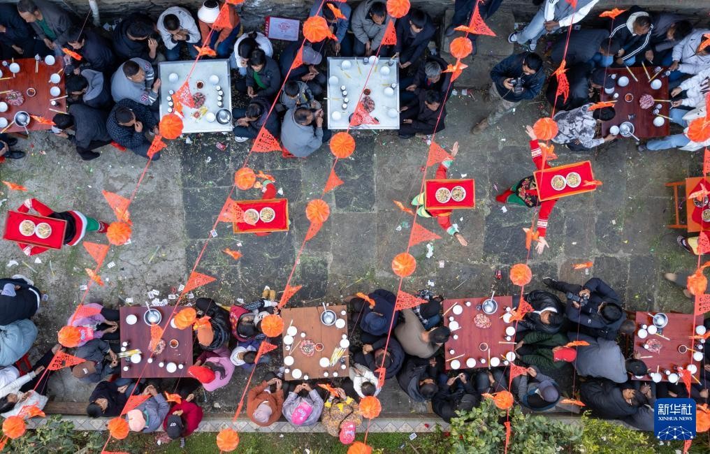 2月7日,跳菜表演者在南涧县宝华镇拥政村一农户家的婚礼上表演(无人机照片)。新华社记者陈欣波摄