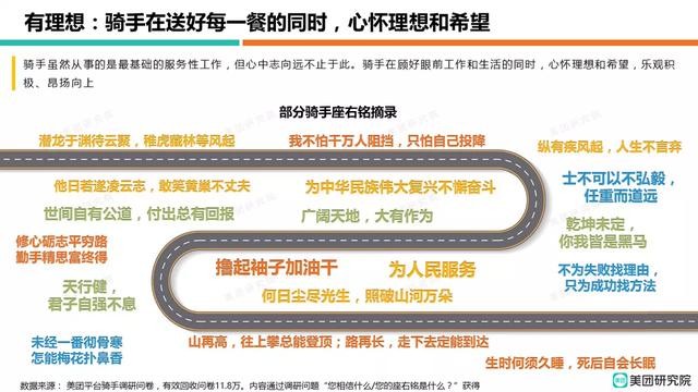 “撸起袖子加油干“成为年度被提及最多次数的骑手座右铭,除此以外,还有“纵有疾风起,人生不言弃”、 “广阔天地,大有所为”等。这些充满斗志的座右铭,有的诉说着个人奋斗,有的诉说着实现社会价值。