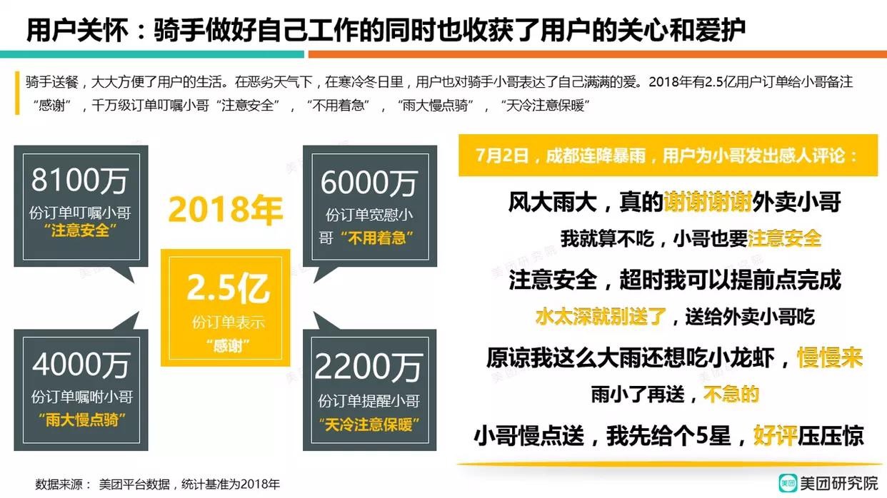 2018年随着外卖业务的边界进一步拓展,骑手配送的内容也从送餐、送饮料扩展到鲜花绿植、生鲜果蔬、生活超市,品类更加丰富。美团《报告》显示,骑手的专业服务收到用户的好评,2018年用户为骑手写下了3亿好评、2.5亿感谢。其中,8100万份订单叮嘱小哥“注意安全”,6000万份订单宽慰小哥“不用着急”,4000万份订单嘱咐小哥“雨大慢点骑”,2200万份订单叮嘱小哥“天冷注意保暖”。