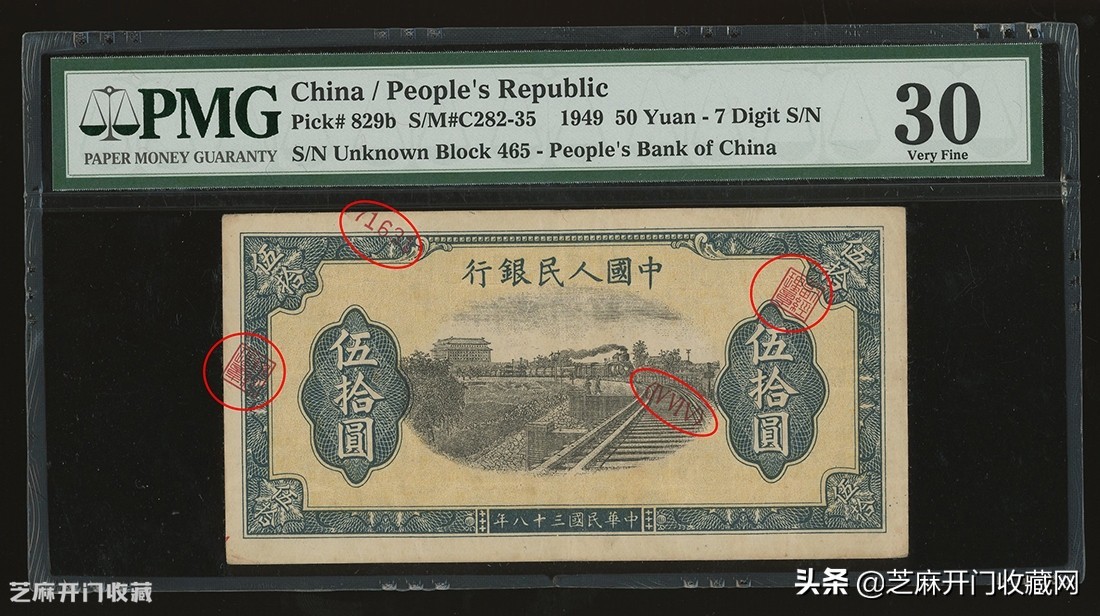 3:中国人民银行第一版人民币50元,黄火车,正面图章及部分编号移印或漏印,PMG30,成交价格: HKD 64800