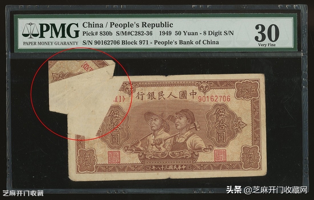 2:中国人民银行第一版人民币50元,工人农民,左上角摺迭複印(大福耳),PMG鑑定,评30,成交价格: HKD 129600
