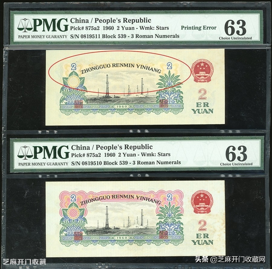 5:中国人民银行1960年第三版人民币2元,背面漏印粉红色错体,PMG皆评63,成交价格: HKD 42000
