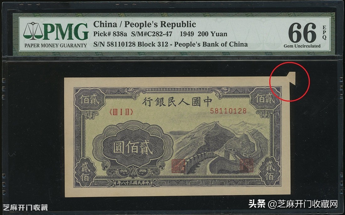4:1949年一版人民币200元「长城」,右上褔耳错票,PMG66EPQ,非常罕有,成交价格: HKD 54000