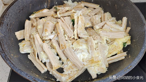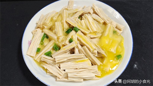 第四步:打散四个鸡蛋,再鸡蛋液里撒入一把葱花,而后将鸡蛋液淋入腐竹里拌匀。锅里加食用油烧热后把腐竹鸡蛋液倒入锅内炒凝固出锅待用,这样腐竹就和鸡蛋“融合”了!