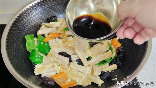 这里的木耳不要和青红椒一块下锅,防止炒的时候炸锅。可以腐竹先下锅,再把木耳至于上面翻炒即可。