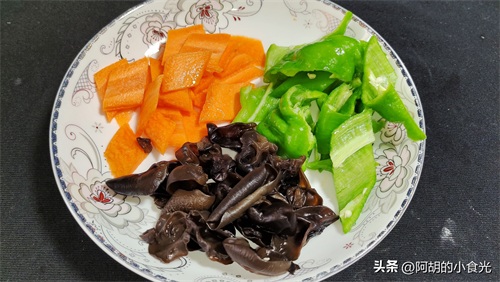 第二步:辅料方面需要准备胡萝卜切片,青椒一根叶切片,再泡发一小把木耳。爆锅的只要准备一把蒜末即可。还有一个碗汁,空碗中加入生抽3汤匙,蚝油2汤匙,清水3汤匙,食盐和鸡精适量搅拌均匀即可。