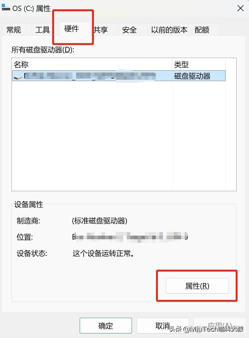 3、在属性窗口中,切换到“硬件”或“设备”选项卡,点击选择“属性”;