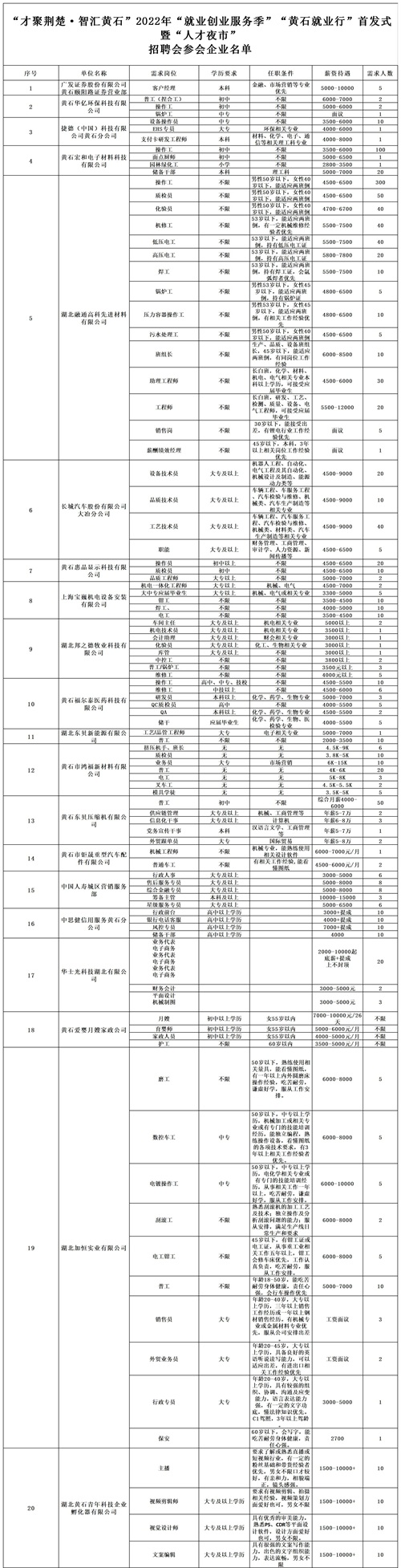 此外,7月15日—8月15日 ,“人才夜市”活动还将在各县(市、区)分别在所属辖区内开展,积极发动街道社区宣传暑期留黄回黄大学生、毕业5年内留黄来黄有就业创业意愿的高校毕业生参加;9月还有在黄高校分会场,各高校工作站分别在所属服务高校内开展“人才夜市”活动,积极发动在校大学生参加活动。