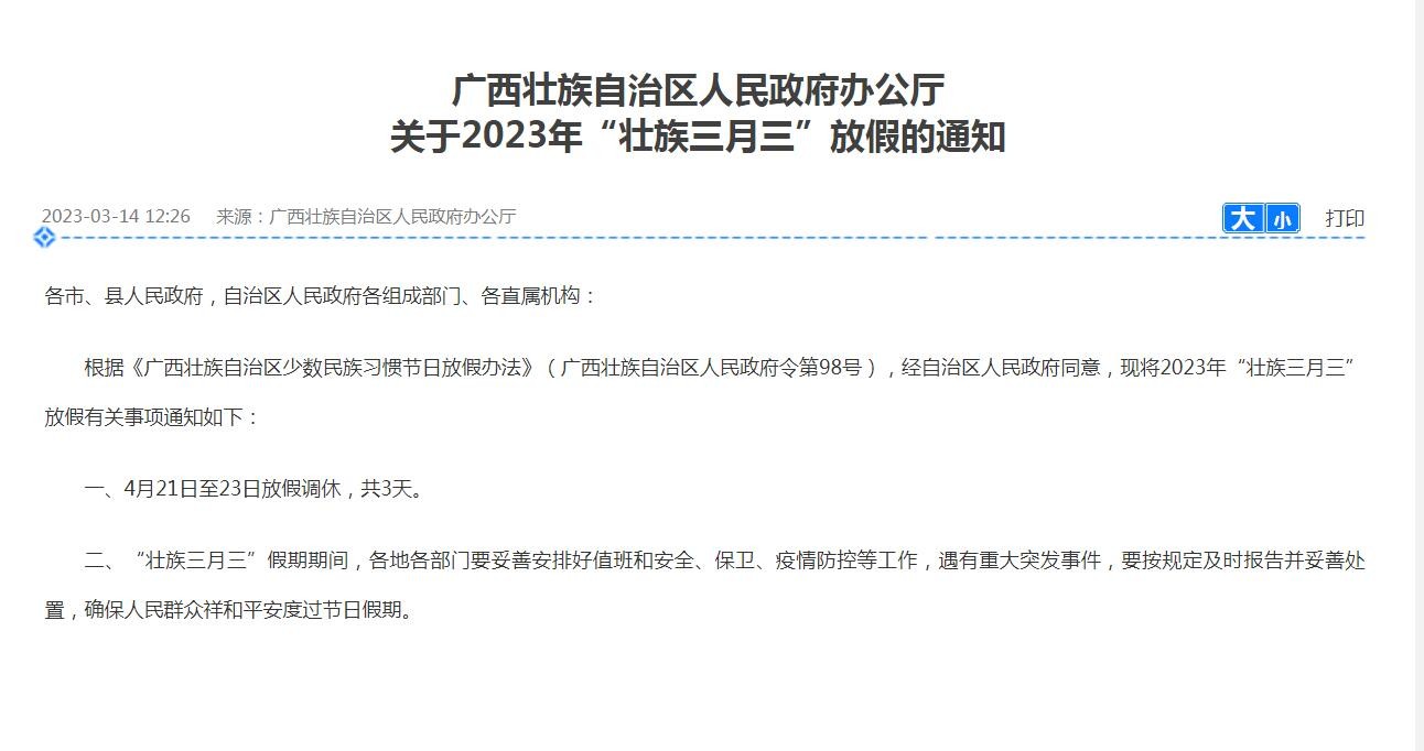 截止目前,广西官方网站并未公布“今年三月三放假安排”,一般会在节日前10天左右公布当年的“广西三月三”放假调休安排。2023年广西三月三放假通知公布时间是3月14日,放假天数是三天。但值得注意的是,2023年农历三月三上巳节是4月22日星期六,因此安排了4月21日至23日放假调休,共3天。
