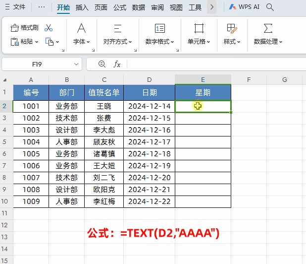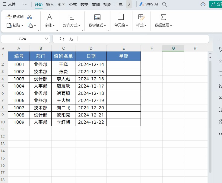 如下图所示,这是一个员工值班信息表,我们需要根据值班日期获取对应日期是星期几。