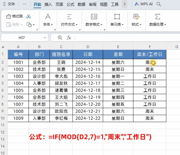 =IF(MOD(D2,7)=1,"周末","工作日")