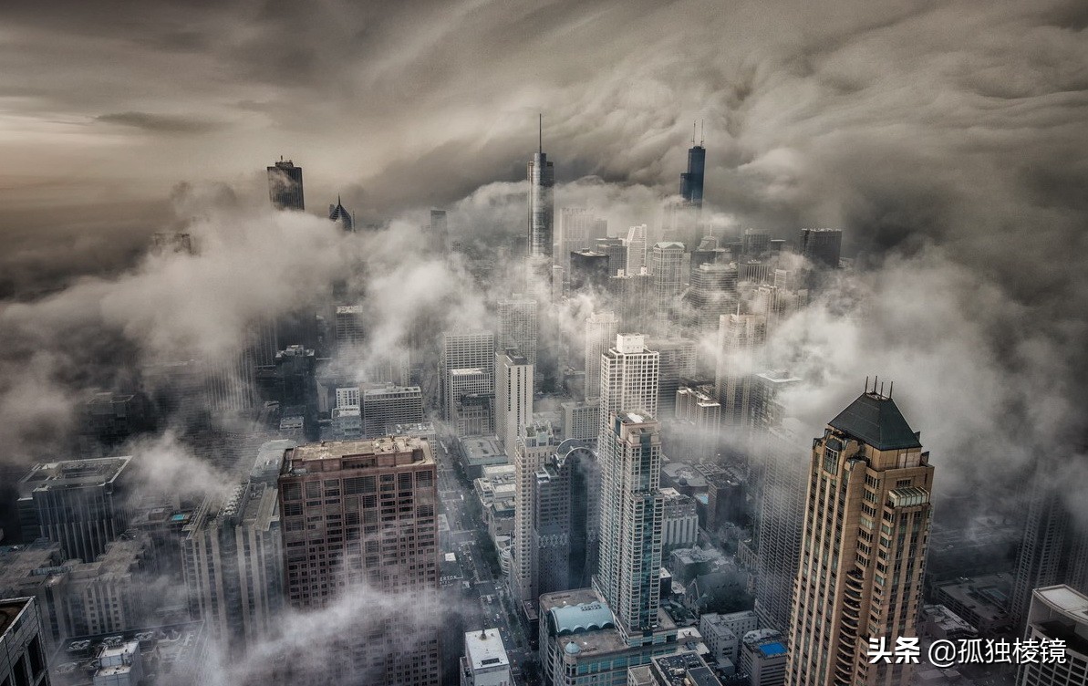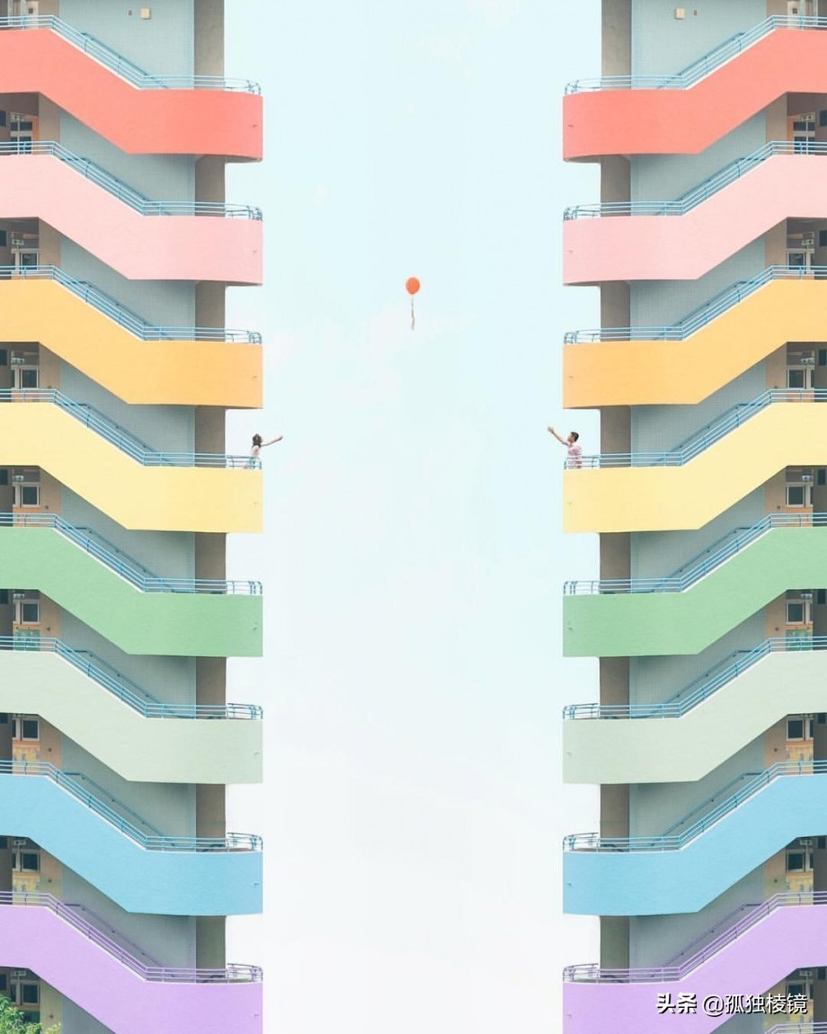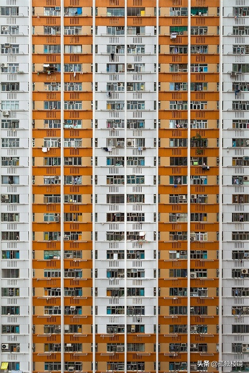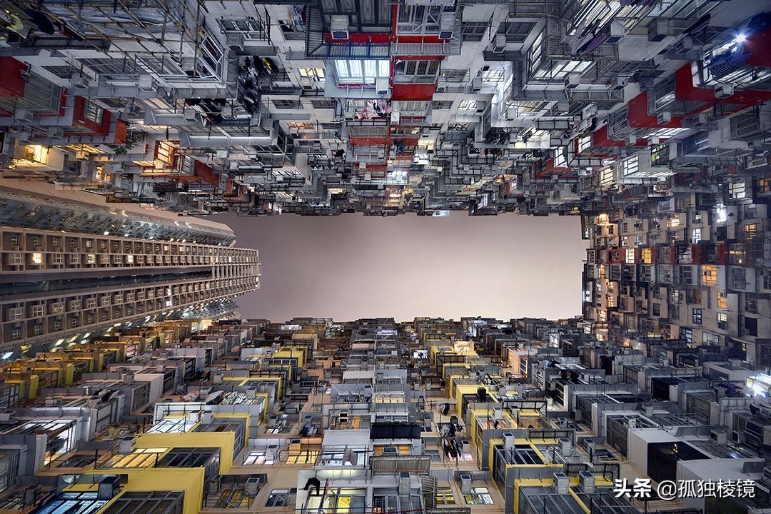 站在香港屯门摩天大楼的下方,以垂直的90°仰拍,以天空为背景,广角镜头将四面大楼不仅交待了环境,而且把摩天大楼怪兽林立、高耸直上的压迫感体现得淋漓尽致。