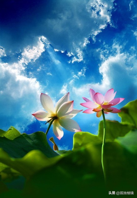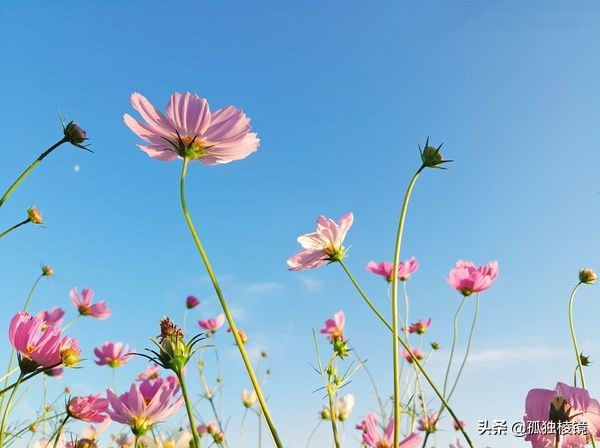 通过仰拍可以巧妙地避开画面中的杂乱背景,使画面简洁干净,主体突出而不受干扰。拍摄花卉时,仰拍能够获取纯净的天空作为背景,让花朵照片更显得唯美动人。即使是路边普通的野花,从低角度以天空为背景拍摄,也可以让整个画面显得非常干净、清新。花朵的在纯色背景的映衬下颜色明快、清丽脱俗,生机勃勃,虽然花枝丛生却一点也不显杂乱。
