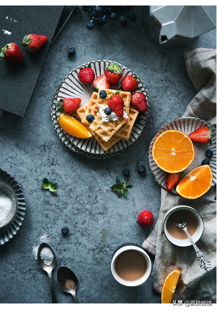 采用俯拍的视角,视野范围大,画面中的景物元素就越多越丰富。美食拍摄中,我们可以看到大量90°俯拍的作品,这是美食摄影中最容易拍出好照片的角度。原因在于: