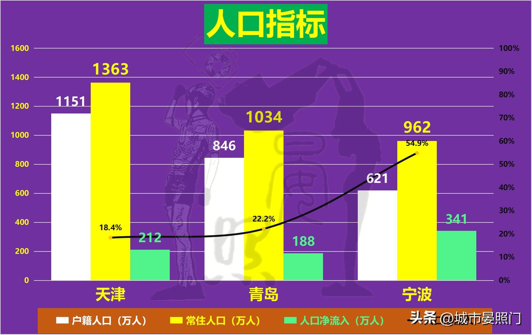 说到城市综合实力,不得不提的第一大控制性因素必然就是城市缔造者的人口了。作为三城中唯一的直辖市,天津不仅在人口上独具一档,而且比人口超千万的青岛足足高出了330万。相比于天津的一马当先,两大单列市之间则是旗鼓相当,虽然一个属于千万级,一个无缘千万级,但彼此之间的人口差其实也只有72万。不过,人口最少的宁波,却在象征经济活力的人口吸引力上反而最强,近乎于是青岛的2倍。