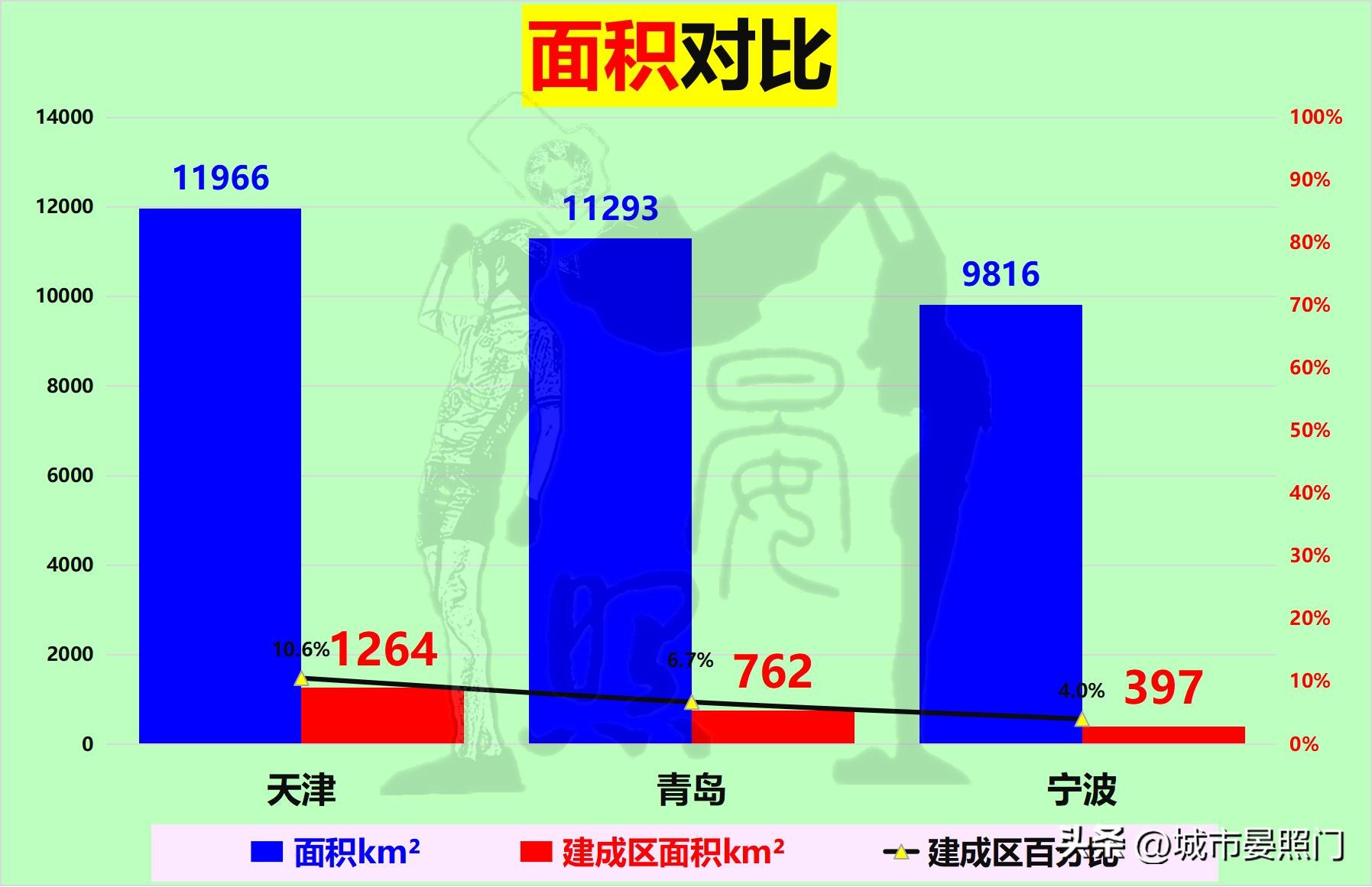青岛虽然在市域面积上,和直辖市天津一样,均处于1.1万km²多点。但在建成区规模上,却呈现出大相径庭的结果。当人口遥遥领先的天津,建成区面积即将突破1300km²之时,青岛却仍然低于800km²,只有天津的60%,远低于人口的70%。无独有偶,同为副省级的宁波,由于面积、人口均垫底,导致在城市发展纵深上再次难以大展宏图,建成区面积甚至不足400km²,只有青岛的一半多点,更是不足天津的三分之一。