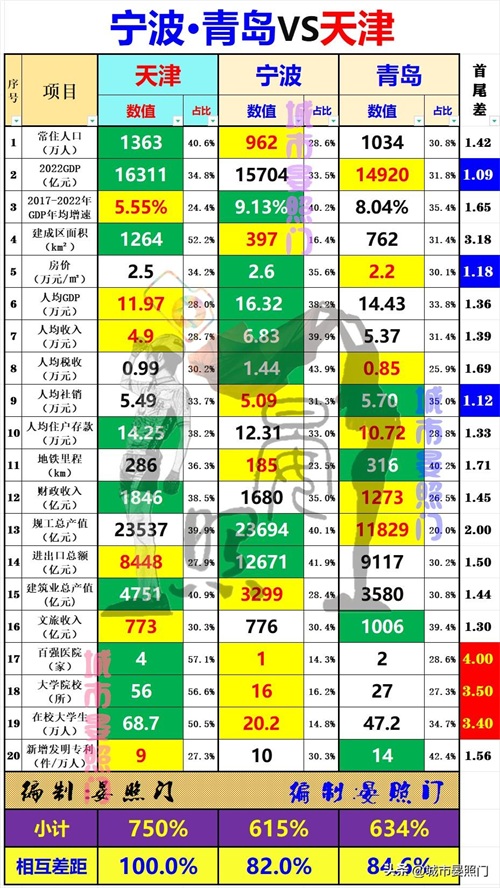 总结:转眼间,关于两大副省级后起之秀的青岛、宁波,与老骥伏枥的直辖市天津,在20项核心指标上的孰强孰弱以及相互差距也就尽收眼底。最后,便是揭晓三城综合实力最终结果的时刻: