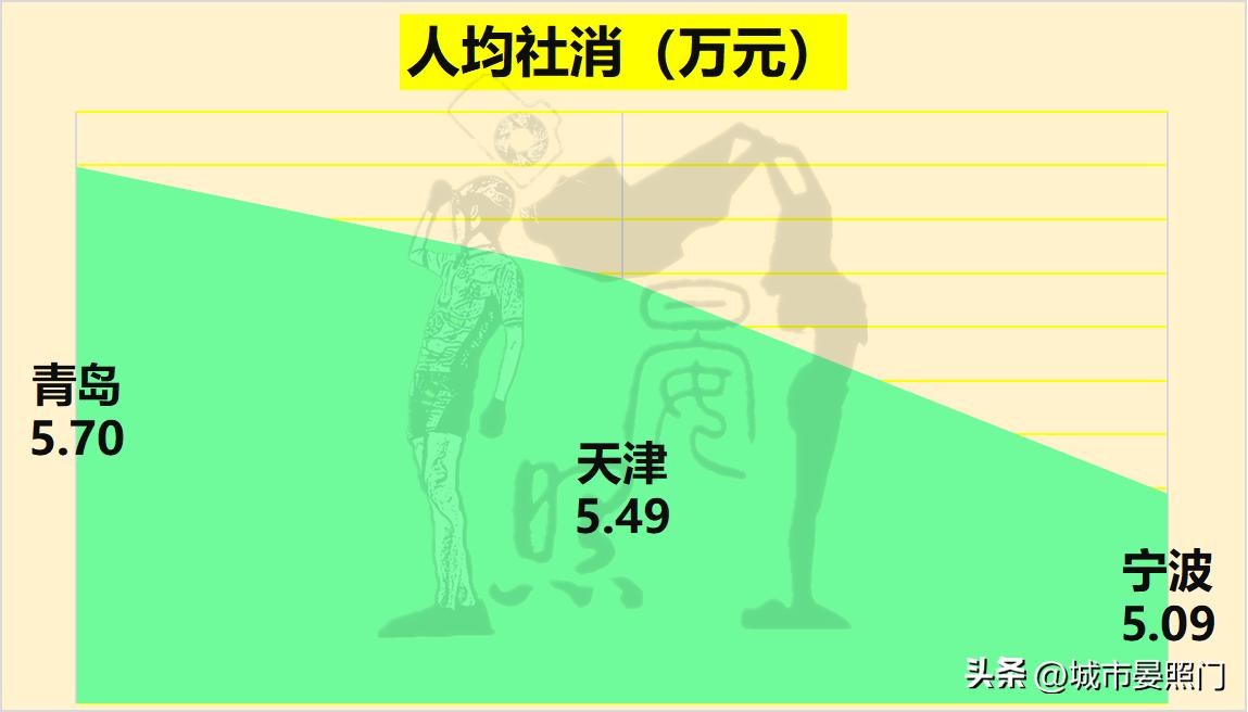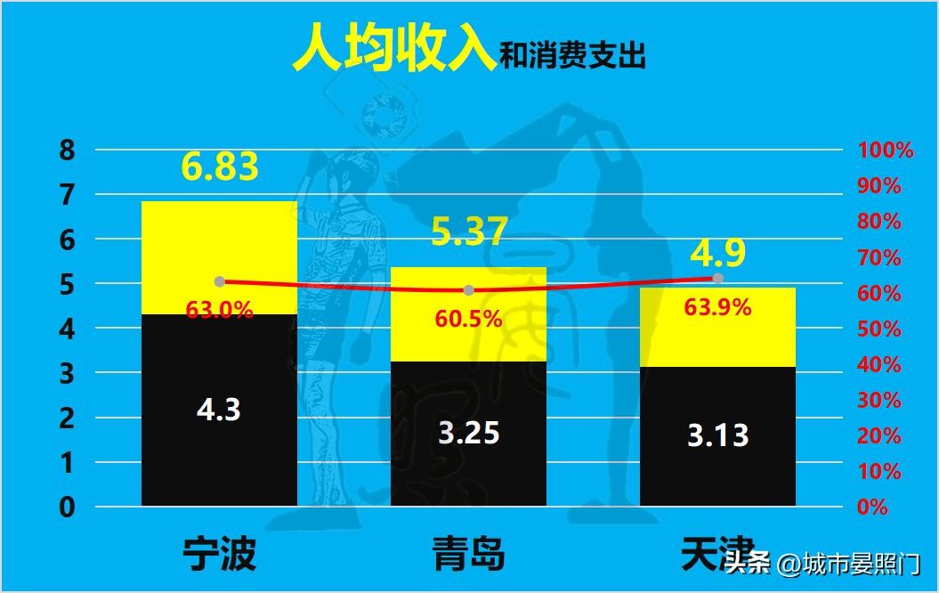 即便是在反映一座城市居民收入水平的人均可支配收入上,作为直辖市的天津,依旧是未能守住自己的优势。不仅再次垫底,而且是三城中唯一低于5万的。反观人均收入即将突破7万的宁波,不仅以1.39倍的压倒性优势再次完胜天津,与此同时,和同为单列市的青岛相比,领先优势也是从人均GDP的13%飙升到了27%。另外,宁波还是三城中,唯一人均消费支出突破4万大关的。