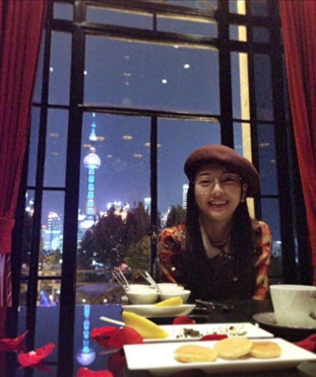 照片中,老公视角下的糖糖头戴贝雷帽,对镜甜笑,很是幸福。