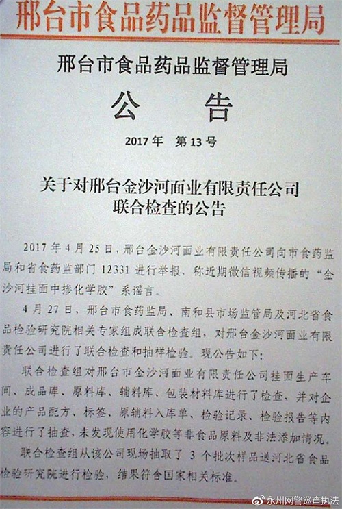 7月9日永州市公安局网警在网上巡查时发现一则“金沙河挂面全是胶的”视频在“祁阳经营同城传媒广告” 内传播,该视频从2017年3月6日上传至2017年7月8日点击率已超500条。信息内容是“一个疑似衡阳口音的男子与一名女子边洗挂面边录视频,其内容:在水池里放有一个钢盆,有一双手洗着白色的东西,旁边有一袋金沙河挂面,并说金沙河的面不要买,你们看到这个转发、转发,全是胶,我这一支面还没有放完,全是白色的胶在这里,这样对人身体不好,这种面实在吃不得,这个猪养的做这种事情,公安为什么不抓这种人,这样对人体有害,全是胶”。