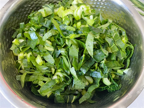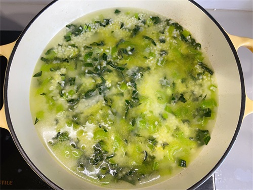 1、青菜去根,清洗掉青菜上面的泥沙,把青菜切成碎末,大米淘洗干净备用;