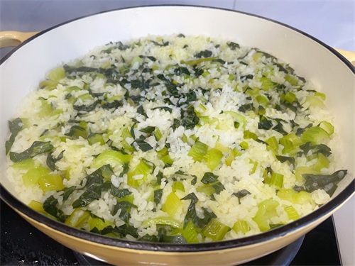 3、将淘洗干净的米一同倒入锅内,然后翻拌均匀,炒到菜和米混合均匀;