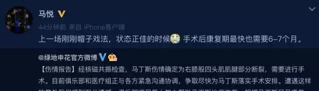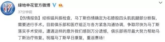 随后申花新闻官马悦也转发了俱乐部的微博,并说明:马丁斯恐怕要缺席6到7个月。