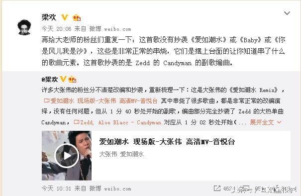然后好景不长,今日歌手音乐人梁欢在微博发文称:"《爱如潮水》这首歌抄袭的是 Zedd 的 Candyman 的副歌编曲。"消息已发出,众多网友纷纷评论和转发,让大张伟又上了热搜榜!