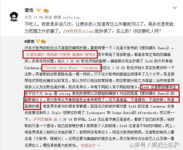 并且梁欢还在微博中发出了大张伟的《爱如潮水》和Zedd的《Candyman 》作为证据与微博网友争辩,并劝其:“如果没有充足的时间,就不要自己编曲了,提供天才主意就好”。