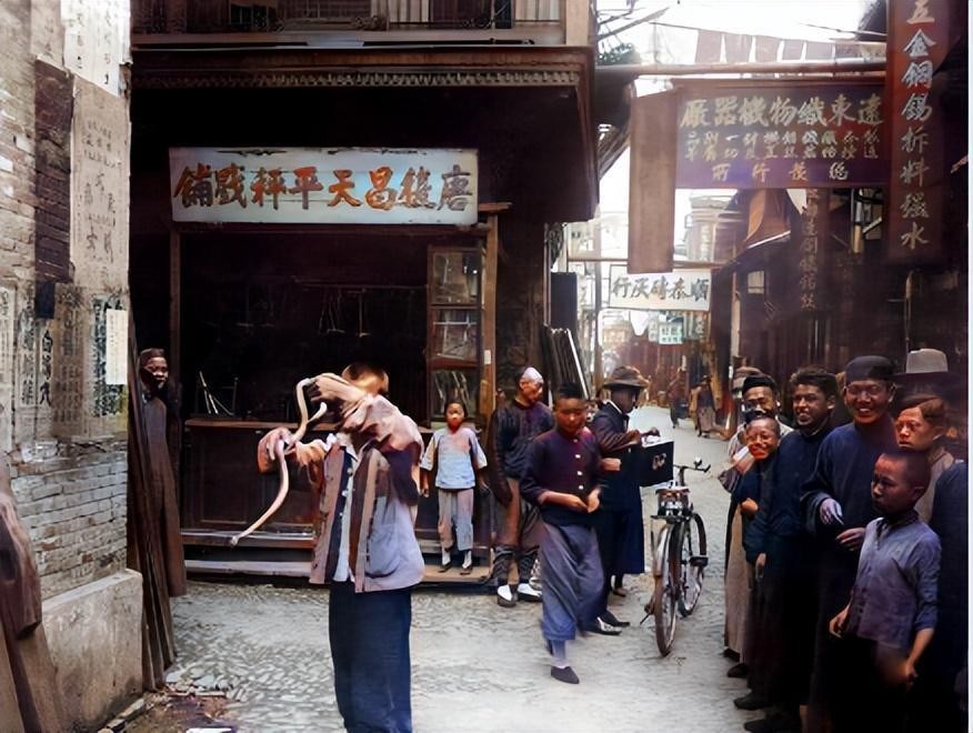 30年代,上海街头。一名男子摆开场子,他从一个竹篓里拿出一条蛇。