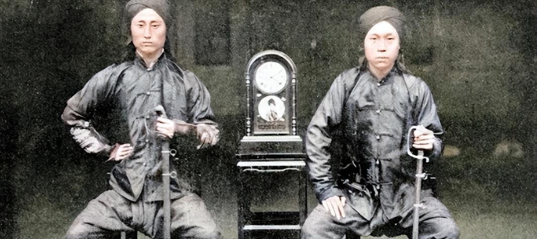 这两名武士小衣襟短打扮,不像是官府清兵,手中刀剑细长且直,也不像是清兵常用的反佩腰刀,右侧这腰间还别着一把短枪。