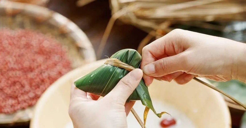 第二天早上起来就可以开始包粽子了,首先我们要把粽子叶围成漏斗的形状,底部放上一颗蜜枣或者大枣,上面撒上泡好的糯米,边缘可以放些花生或者红豆,顶部再放1颗蜜枣。放好之后,将没有放米的另一端的粽叶两侧向里面折,最后用绳子捆紧,一定要捆紧,否则煮粽子的过程中会散开,刚开始会不太熟练,多做几个就好了。