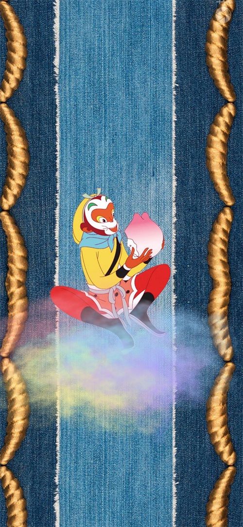 下面这张壁纸,福图一刻背景是拼接的青花元素,4张图片拼接而成。悟空吃着蟠桃,美!