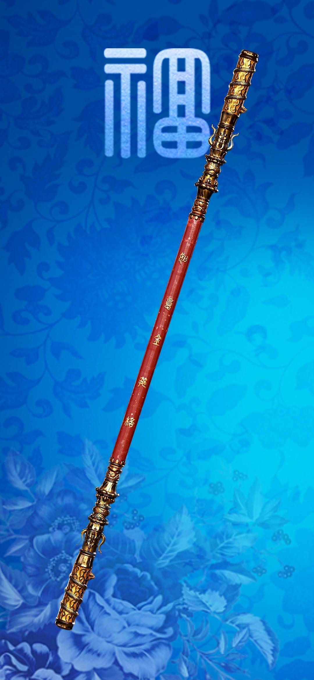 下面这张壁纸,是朋友们最喜欢的一张,是青花和蓝色背景,我放置了一个篆体福字在上方,同时进行了特效处理。然后斜着把金箍棒图片元素放置在画面中。祝福朋友们横扫一切阴霾和不快,把生活过成诗,福气满满。