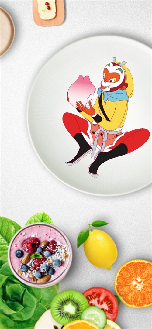 下面这张壁纸,我把悟空吃蟠桃的图片印到了盘子上,下方是水果,都是悟空爱吃的,我也爱吃。
