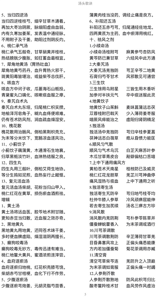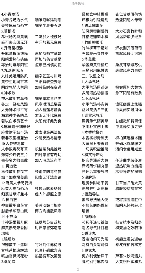 《汤头歌诀》便是这样一部流传较广的方剂学著作,全书共一卷,以韵语编成七言歌诀的形式,并按照《医方集解》的分门加以归纳,概括了补益、发表、攻里、涌吐等20种,选录中医常用方剂320首,并于每方后附以简要注释。全书记述齐全,名称、组成、功用、主治、随证加减等都写入方歌中,内容简明,方便人们学习,音韵工整,便于记忆,方便运用。该著作刊于1694年,刊印后后人多有续补、增注和改编,现存有清刻本、石印本和铅印本等50余种。该书言简意赅、简明扼要、音韵工整,读之朗朗上口,便于背诵使用,一时成医界美谈,深受广大中医学者的欢迎,也是中医学者学习方剂学的必读佳作,适合广大中医爱好者及初学者学习参考。市面上很容易买到,感兴趣的朋友可以入手一本进行学习。