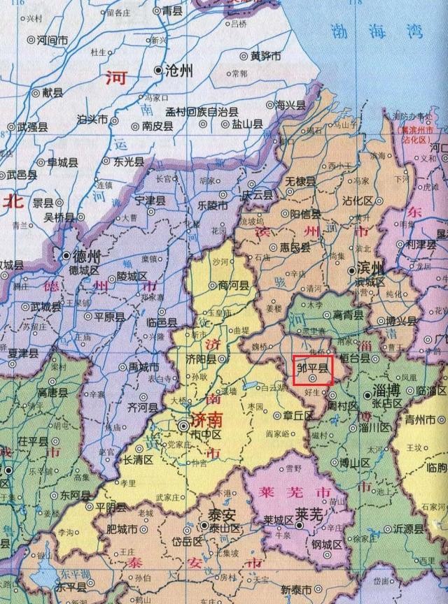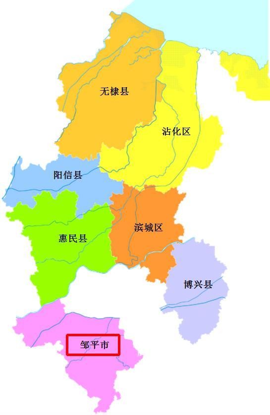 从上面的山东省行政区划地图中可见,邹平市是滨州市一个“孤悬南侧”的县级市,处于另外两个地级市的包围当中:济南市在西、淄博市在东。