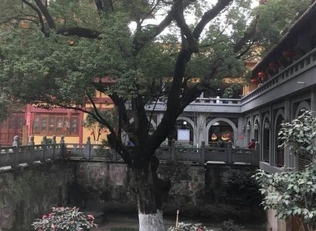 寺院距繁华商业区仅百米,因有龙山屏障,闹中取静,不受干扰,宛若世外桃源。寺内有三棵古樟,绿意盎然,三四人方能合抱,树龄最大者三四百年,更增幽雅也。