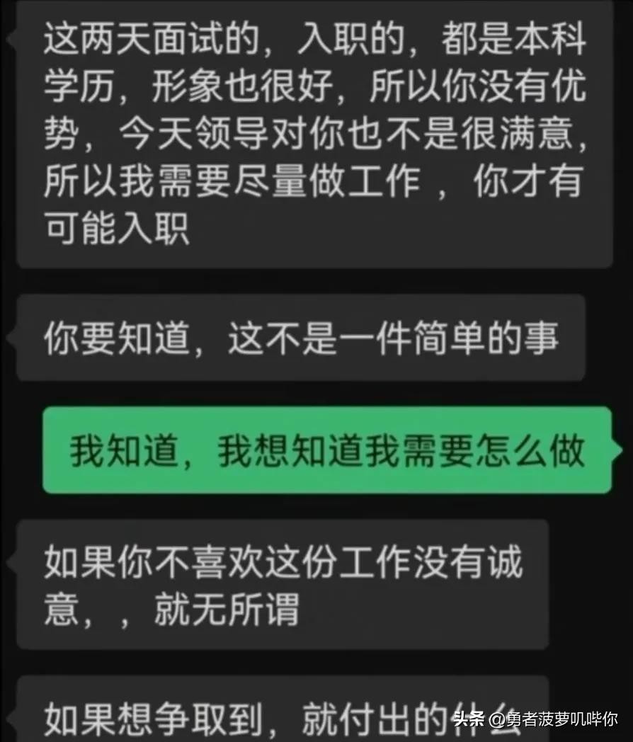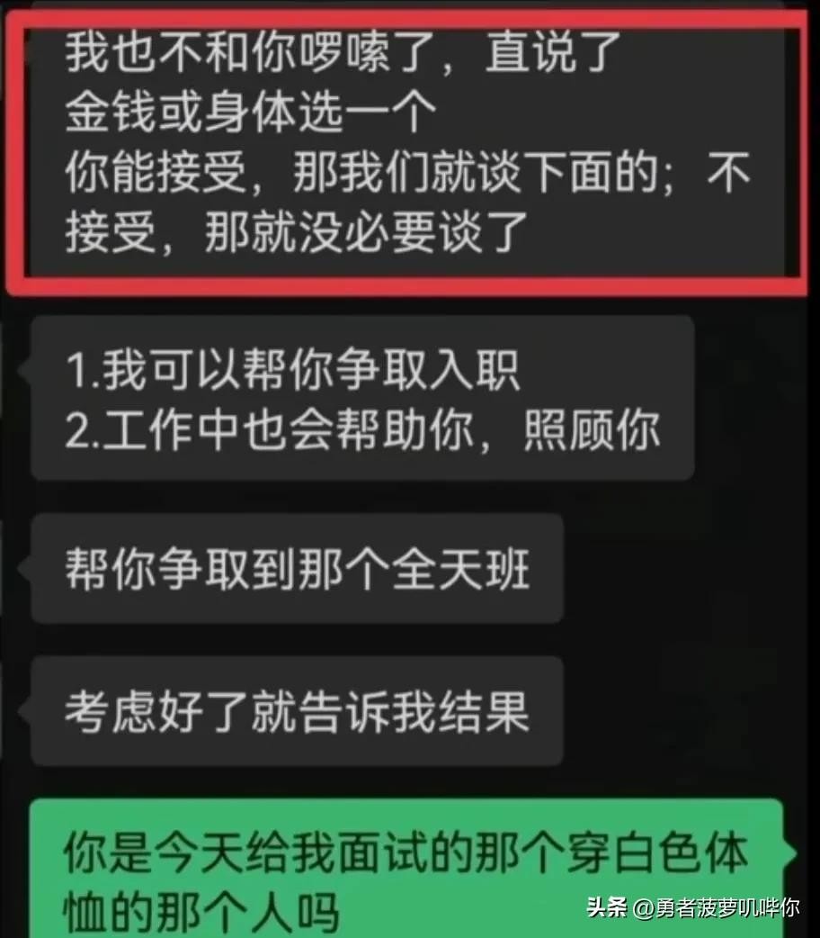 据该女性面试人员透露,招聘工作人员在私信中明确表示,领导对她的面试并不满意,需要她提供金钱或身体方面的回报才能入职。面试人员对此表示坚决拒绝,并将聊天记录曝光。