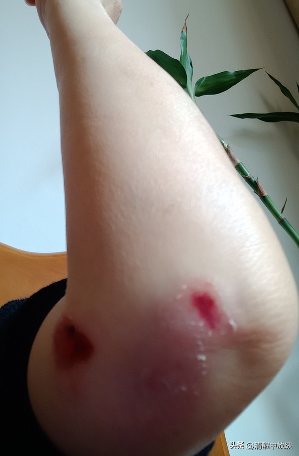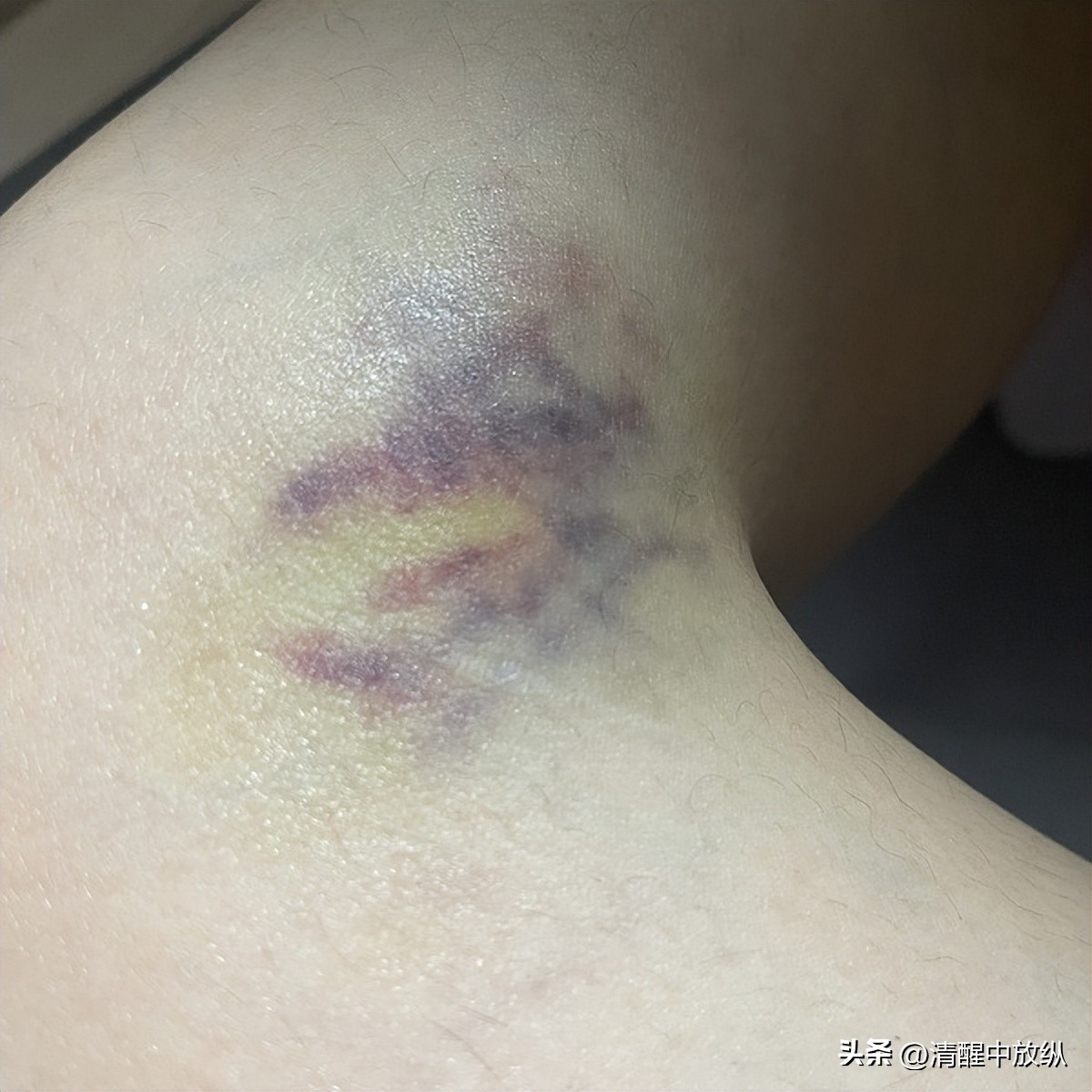 我这是电车摔了立马拍的,不会那么快淤青,但是会有个大包,下午摔晚上才淤青