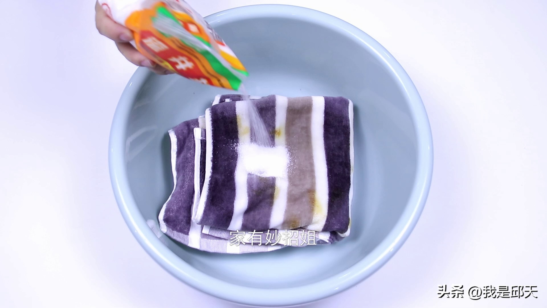 其实想要把毛巾清洗干净,方法也特别简单,我们先把脏的毛巾放在盆中,然后往里面倒入一点食盐,食盐具有杀菌消毒的作用,可以有助于将毛巾上滋生的一些螨虫、细菌之类的消灭掉。