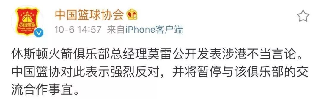 尽管莫雷事后迅速删除该消息,但他的言论造成的不良影响还在不断放大。6日下午,中国篮协通过官方微博发表声明,宣布“休斯顿火箭俱乐部总经理莫雷公开发表涉港不当言论。中国篮协对此表示强烈反对,并将暂停与该俱乐部的交流合作事宜。”