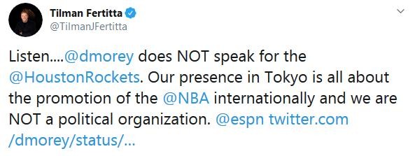 发现事态走向不利于球队的方向后,休斯顿火箭俱乐部老板蒂尔曼-费尔蒂塔5日在个人社交媒体发布了一条动态:“听着……莫雷的言论不能代表休斯顿火箭。我们在东京的活动是在国际上推广NBA,我们不是一个政治组织。”