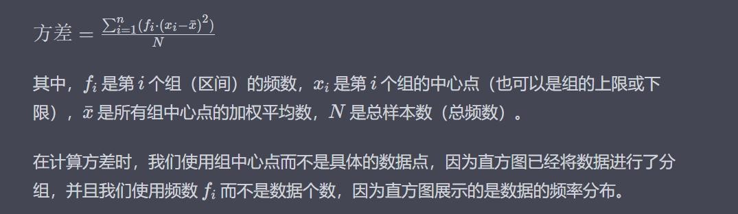 方差是用来衡量一组数据的离散程度的统计量。对于频率分布直方图,计算方差的公式稍有不同。方差的计算公式为: