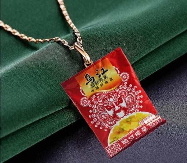 黄世聪说我们“穷”得都吃不起榨菜了,这必须要让他开开眼才行了。粗金链子配上四川脸谱包装,既奢华又个性,涪陵榨菜胸前挂,你就是整条gai最靓的仔!