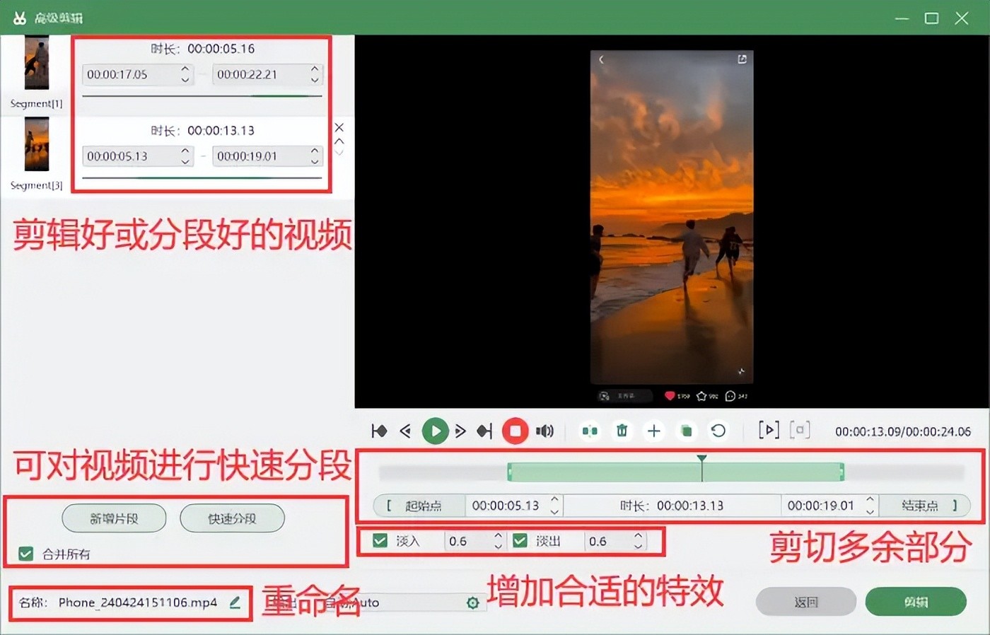 步骤4:录制完成的视频,您可以进入【高级剪辑】页面对您的视频进行剪辑或增加特效等操作,还可以对视频进行快速分段。剪辑完毕还能对视频进行重命名,方便您日后的查找和分享。