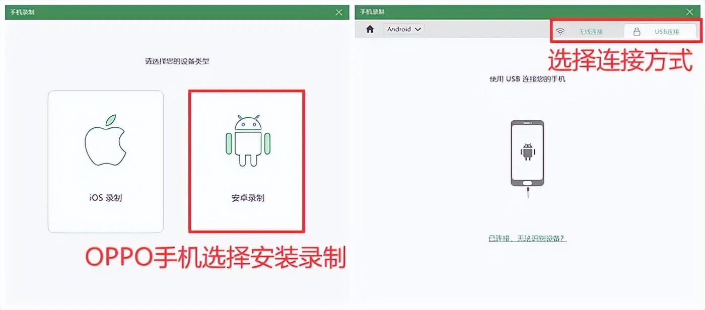 步骤2:根据您的手机选择设备类型,OPPO手机选择【安卓录制】,并选择合适的连接方式将手机和电脑连接起来。